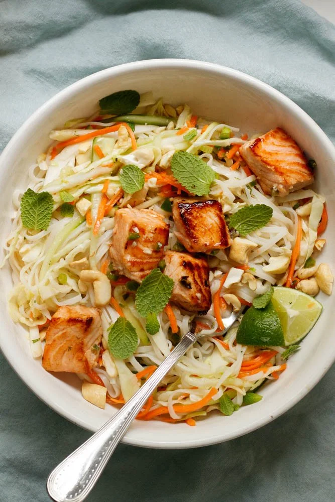 In a large bowl combine the carrots, cabbage, cucumbers, cashews, and half of the mint. Fold in the rice noodles and the remaining sauce. Top with remaining mint.